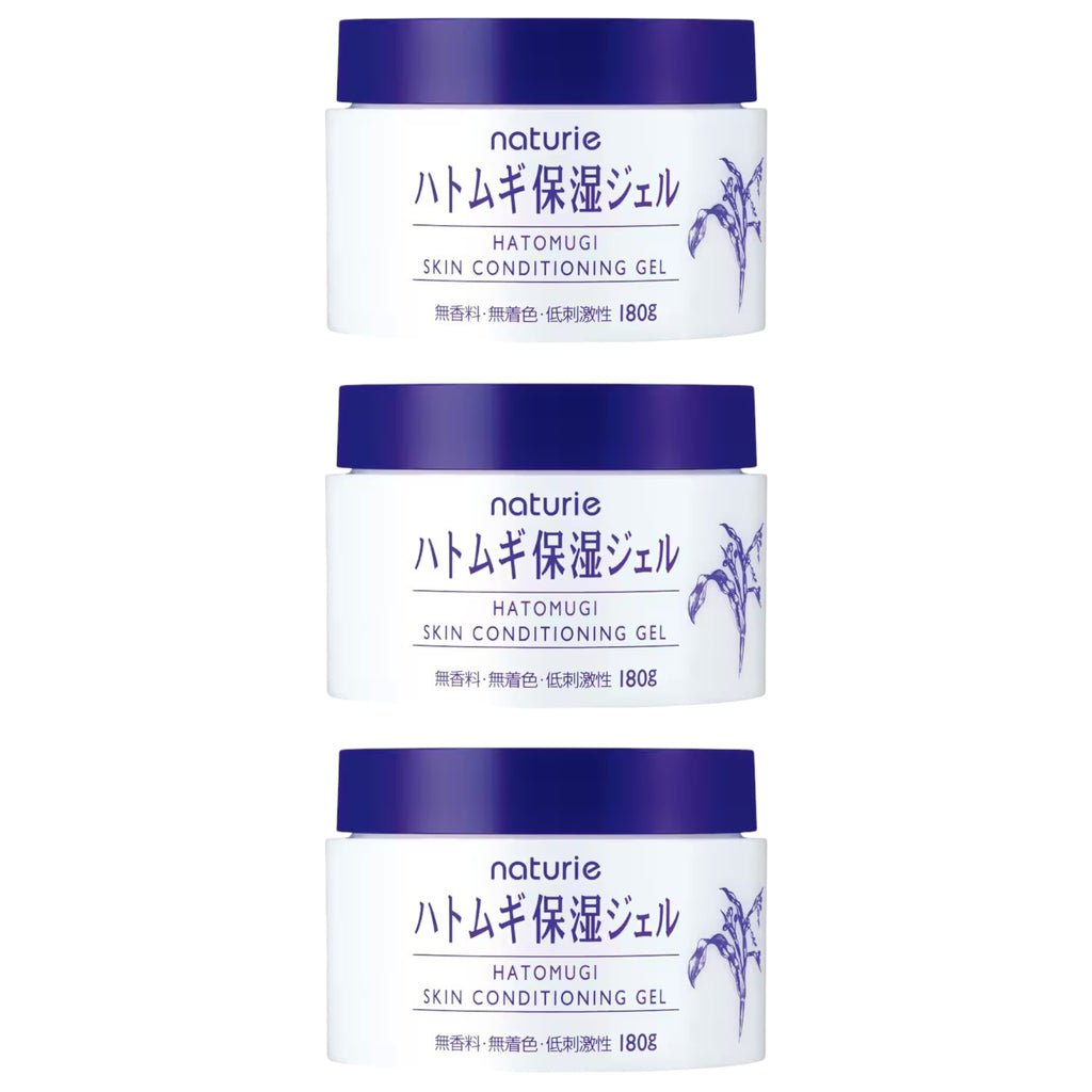 DescriptionThree jars of alcohol-free Hatomugi moisturizing gel for dry, sensitive, or oily skin.