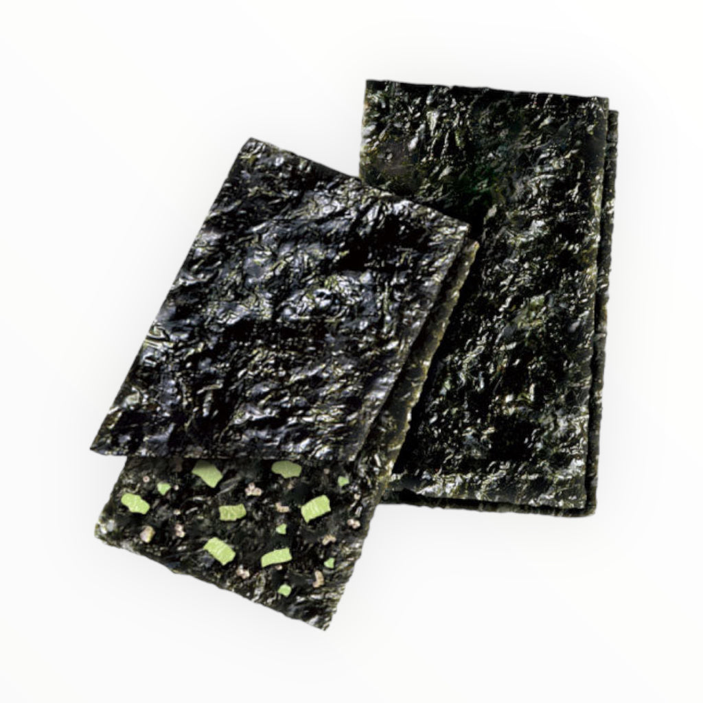 Crispy snack made with seaweed from Ariake Sea, filled with wasabi-flavored granules and salt.