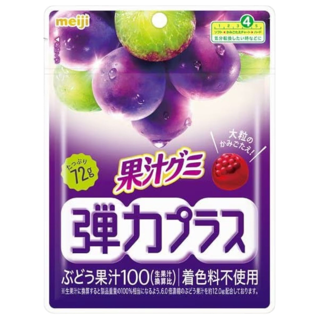 Meiji Kajyu Gummy Chewy Plus Grape offers a firmer, more satisfying bite while keeping the juicy flavor of real grape juice.
