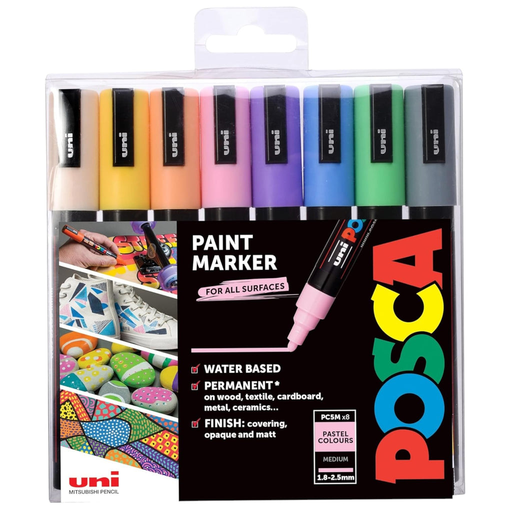 The Uni Posca Paint Marker set includes 8 soft pastel colors with a medium bullet tip (1.8–2.5mm). These water-based pigment ink markers deliver opaque, vibrant color and work on a variety of surfaces including paper, wood, metal, glass, and plastic. Ideal for artists, crafters, and creative projects.