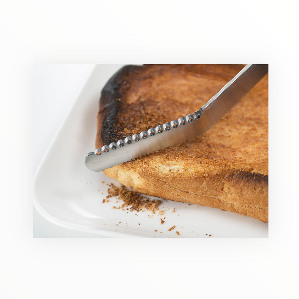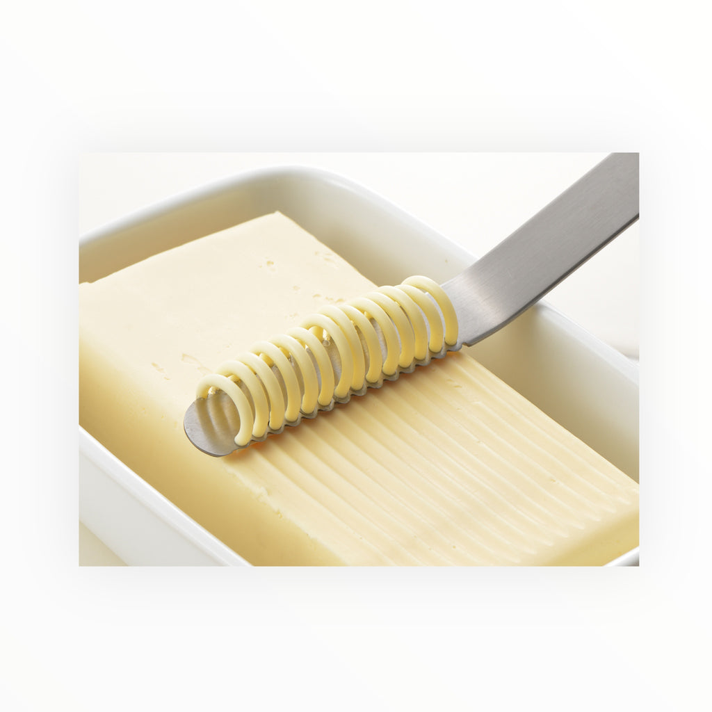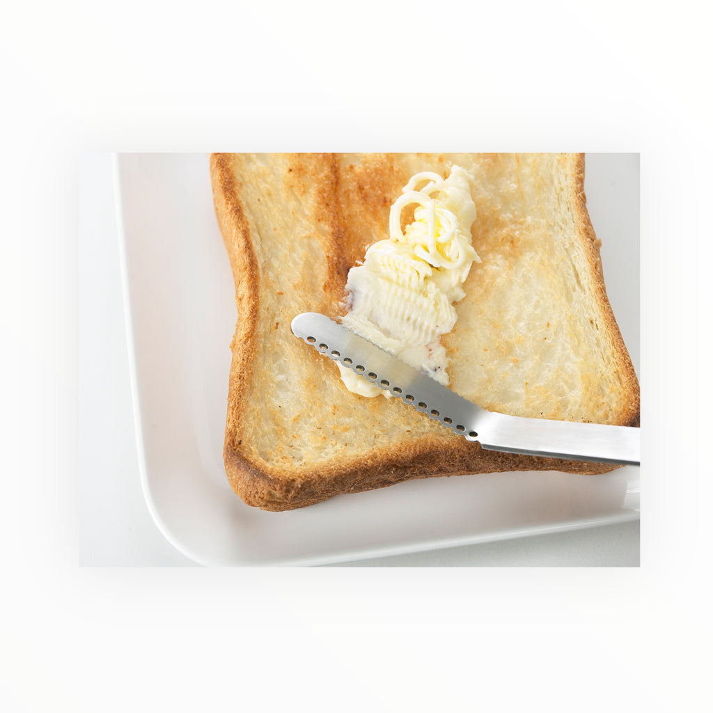 The Nulu Butter Knife is designed for easy spreading and scraping, making it an essential tool for any kitchen.Effortlessly spread firm butter in thin threads with the slanted small hole, allowing for easy application. The serrated edge can also be used to scrape off burnt parts. Constructed with sturdy one-piece molding for durability, ensuring longevity of use. To use, press gently against the butter, almost parallel to its surface, and slide from left to right.